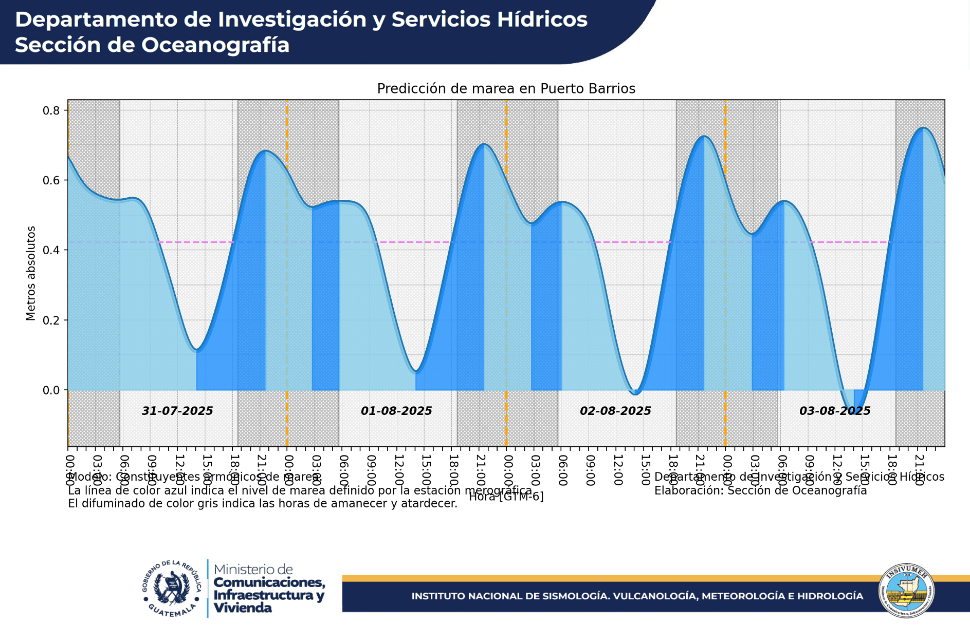 Partiendo del método de armónicos y mediante la librería pytides de Python3 se generó el script que analiza los datos registrados por las estaciones mareográficas de Puerto BarriosChamperico y Puerto San José, obteniendo así un pronóstico de 4 días partiendo del día de publicación de esta sección.